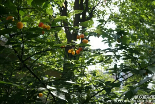 有句老話說得好:“櫻桃好吃樹難栽。”看雙童種下的這幾棵櫻桃樹,多精神,樹上結(jié)的果子也是不少呢!看照片,這櫻桃都長到墻外去了!