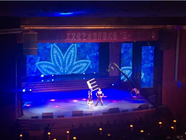 晚會(huì)在大合唱《咱們工人有力量》中拉開(kāi)序幕。配樂(lè)詩(shī)朗誦、舞蹈、歌曲、樂(lè)器獨(dú)奏紛紛上臺(tái)表演,由國(guó)家一級(jí)演員張艷、大剛表演的雜技《足尖上的藝術(shù)》,把我們“雙童”的壽星們可都看驚呆了!