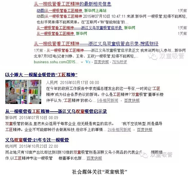確實(shí),近兩年,“雙童吸管”不斷地被新華社、人民網(wǎng)等各大媒體作為“工匠精神”的代表企業(yè)推到臺(tái)前,我們也深受鼓舞,就像當(dāng)家人樓總所說,我們一定要把產(chǎn)品做成“精品”,企業(yè)才有將來!下面,就請(qǐng)大家和吸管妞一起來看看這一篇精彩的文章吧!