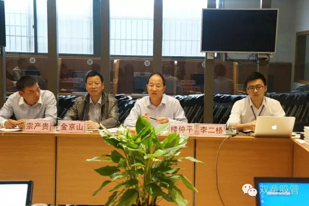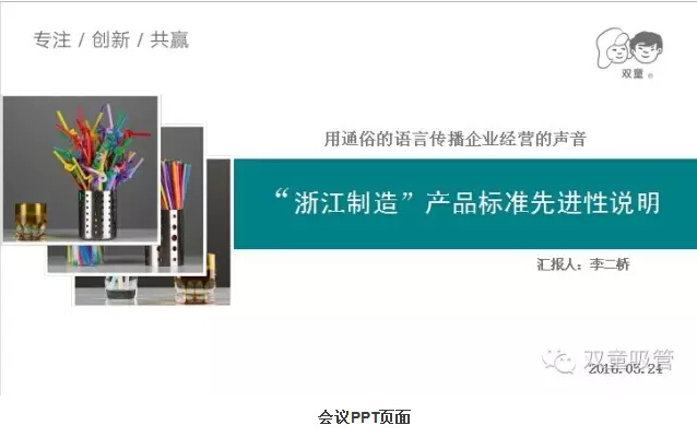 會議中,“雙童”董事長樓仲平向各位領(lǐng)導闡述了“雙童”一直以來對標準化工作的重視,并是目前浙江省唯一由單一企業(yè)承擔行業(yè)標準、國家標準和國際標準起草編制任務(wù)的中小企業(yè)??偨?jīng)理李二橋則詳細地向各位領(lǐng)導介紹了聚丙烯吸管的標準初案、編制說明(包括標準對比、分析、驗證、說明材料)及先進性介紹。