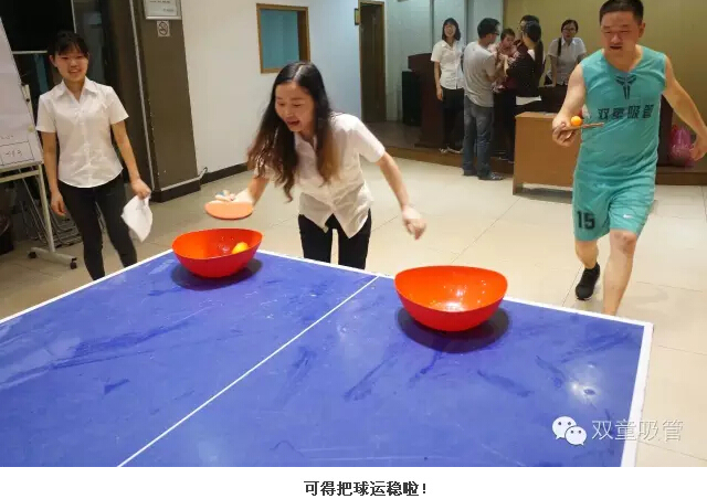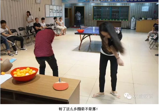 別急!先來(lái)玩玩小游戲。瞧!捏鼻子 轉(zhuǎn)大象、定點(diǎn)投乒乓球等游戲?qū)映霾桓F。大伙運(yùn)球之前必須先轉(zhuǎn)上5圈,哎呀!還沒(méi)拿起球拍運(yùn)球,就暈在乒乓球桌上了!逗得在場(chǎng)觀眾們都捧腹大笑!
