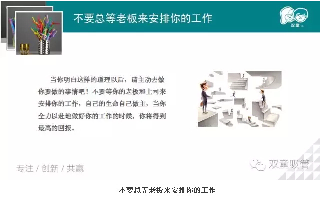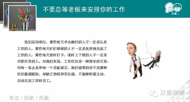 接下來(lái),李講師又從不要總等老板來(lái)安排你的工作進(jìn)行講解。是啊!我們應(yīng)該主動(dòng)去做事情,而不是等你的老板和上司來(lái)安排你的工作。