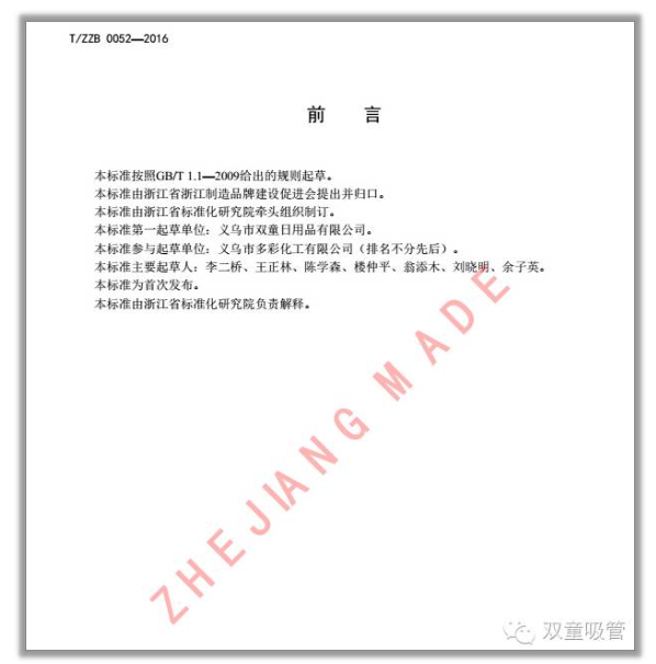 2016年開始,在陳學(xué)森的主導(dǎo)下,“雙童”開展了“浙江制造”多項吸管行業(yè)團(tuán)體標(biāo)準(zhǔn)的起草工作,《聚丙烯飲用吸管》,《聚乳酸可降解冷飲吸管》和《一次性紙質(zhì)飲用吸管》浙江團(tuán)體標(biāo)準(zhǔn),強(qiáng)有力地推進(jìn)了公司的標(biāo)準(zhǔn)化建設(shè),有效地提升行業(yè)影響力和品牌美譽度。