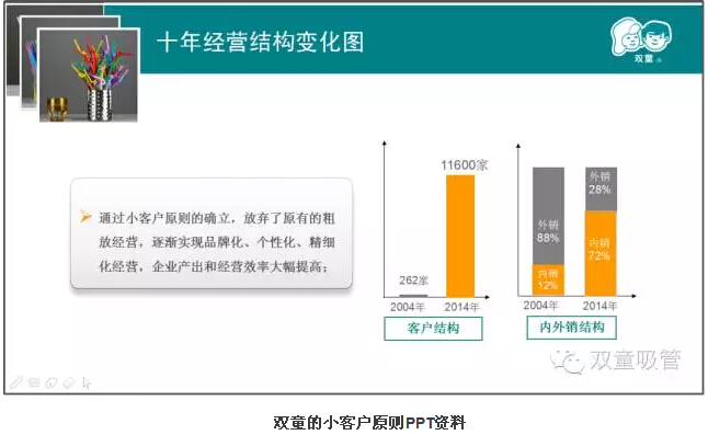 當(dāng)家人介紹,“雙童”的經(jīng)營(yíng)理念之一便是“小客戶原則”。通過(guò)“砍掉”大客戶,專注開(kāi)發(fā)小客戶的經(jīng)營(yíng)模式,使“雙童”不斷追求更高品質(zhì)的產(chǎn)品,滿足消費(fèi)者個(gè)性化的需要。