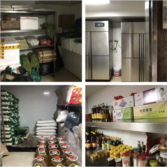 其中采購入庫的魚、肉等易腐爛變質(zhì)的葷菜必須分區(qū)妥善保存在冰箱中,新鮮蔬菜與米、面等主食原料分開存放;除了常規(guī)的食材分開存放外,食用油、大米、面粉、面條、調(diào)味料等食材消耗品,進(jìn)行分類、分架、隔墻、離地存放。