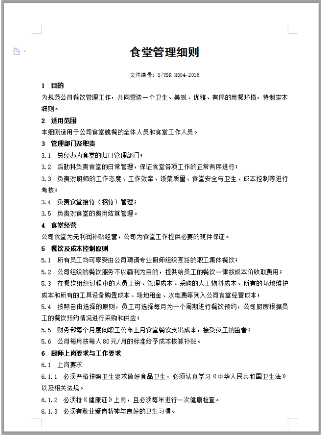 “雙童”食堂管理細則,涉及到餐飲管理的各個方面