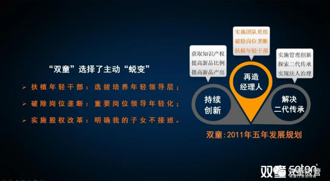 2010年,樓仲平在理解人性活力的“自然遞減”的現(xiàn)象以及經(jīng)理人老化自然規(guī)律后,下定決心通過《雙童五年發(fā)展規(guī)劃》的組織變革來實施解決“經(jīng)理人老化”問題:明確扶植年輕干部,選拔培養(yǎng)優(yōu)秀的年輕領(lǐng)導(dǎo)層,解決二代傳承接班等問題。