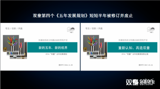 • 2016年9月“雙童”第三個《五年發(fā)展規(guī)劃》發(fā)布。但在發(fā)布以后,我們也發(fā)現(xiàn)在巨變時代下,短短幾個月時間內(nèi)外部環(huán)境就會產(chǎn)生巨大變化,企業(yè)經(jīng)營往往“計劃趕不上變化”;