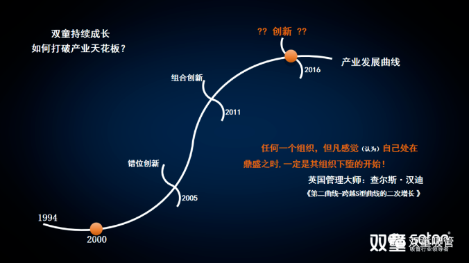 經(jīng)過深度的思考、分析后“雙童”逐漸做出戰(zhàn)略調(diào)整,突破原有“只做一根吸管”的思維禁錮,決定發(fā)展“第二曲線”,通過組織變革,最大程度地激活員工的創(chuàng)造力,打造雙童創(chuàng)業(yè)共享平臺,在企業(yè)內(nèi)孵化出優(yōu)秀的創(chuàng)業(yè)項目,實現(xiàn)企業(yè)的跨越式可持續(xù)發(fā)展。
