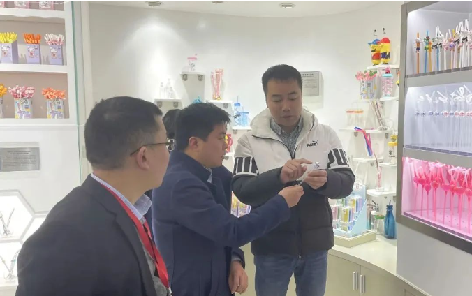 走到創(chuàng)意吸管的區(qū)域,領(lǐng)導(dǎo)們的眼神瞬間被各種不同功能的創(chuàng)新吸管所吸引。可以讓小朋友吃藥吃糖果的哈哈吸管、飲料在臉上回流的眼鏡吸管、“秀恩愛(ài)”的愛(ài)心吸管…… 領(lǐng)導(dǎo)們直呼太神奇了!
