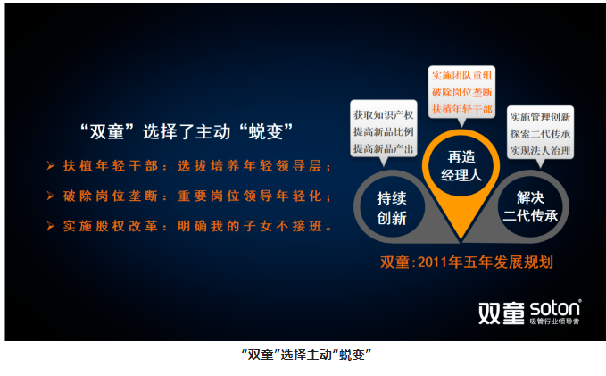 2010年前后,“雙童”大部分管理層由于年齡偏大,逐漸難以適應(yīng)數(shù)字化環(huán)境帶來的挑戰(zhàn),管理上創(chuàng)新不足,奮斗意識(shí)開始持續(xù)下降,“雙童”因此選擇主動(dòng)“蛻變”,調(diào)整管理人員結(jié)構(gòu),并在組織關(guān)系原則中明確有血緣關(guān)系的直系親屬不得進(jìn)入管理層,作為巨變時(shí)代下的自救手段。