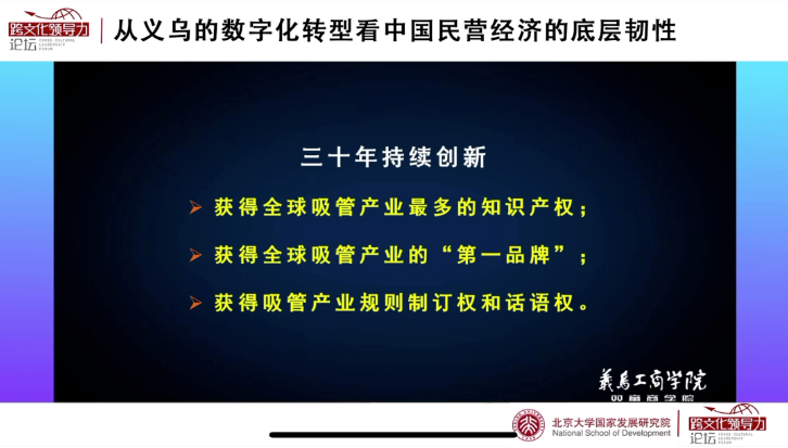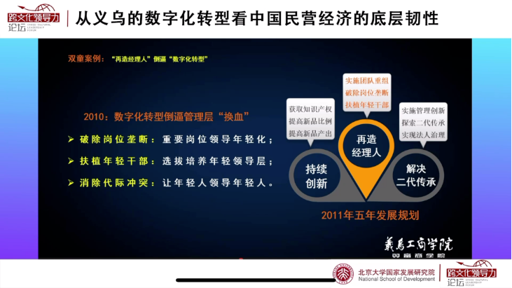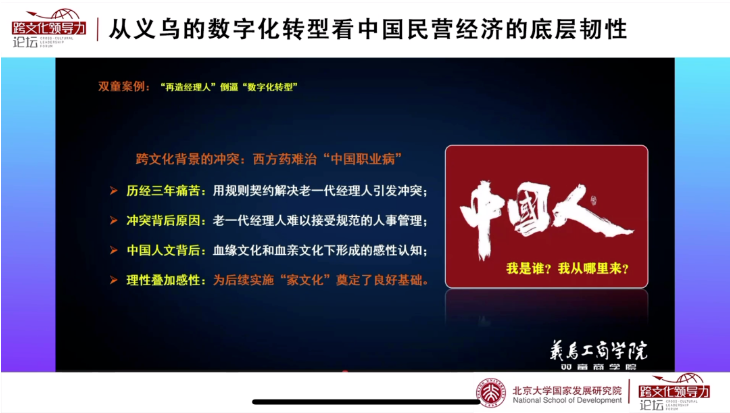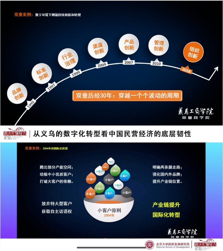 近期,“雙童”樓仲平受北大國(guó)發(fā)院邀請(qǐng),在跨文化領(lǐng)導(dǎo)力論壇做線(xiàn)上直播《從義烏的數(shù)字化轉(zhuǎn)型看中國(guó)民營(yíng)經(jīng)濟(jì)的底層韌性》課程。這堂直播課上,樓仲平從中國(guó)造隱形冠軍的視角,帶領(lǐng)大家感受中國(guó)民營(yíng)經(jīng)濟(jì)的國(guó)際化轉(zhuǎn)型,及其歷次轉(zhuǎn)型中展現(xiàn)出來(lái)的底層韌性。