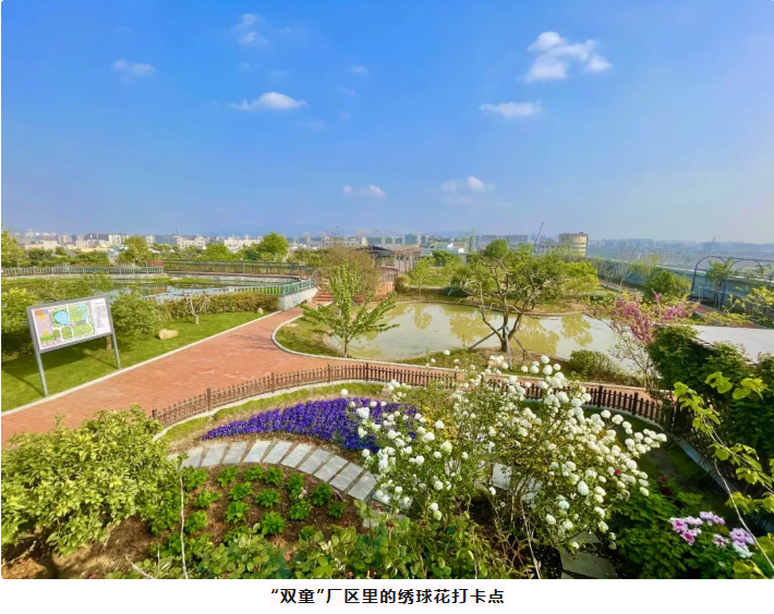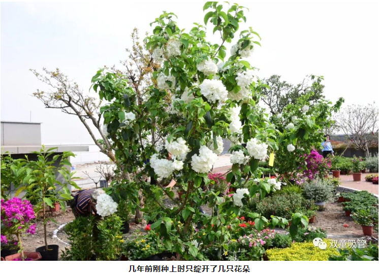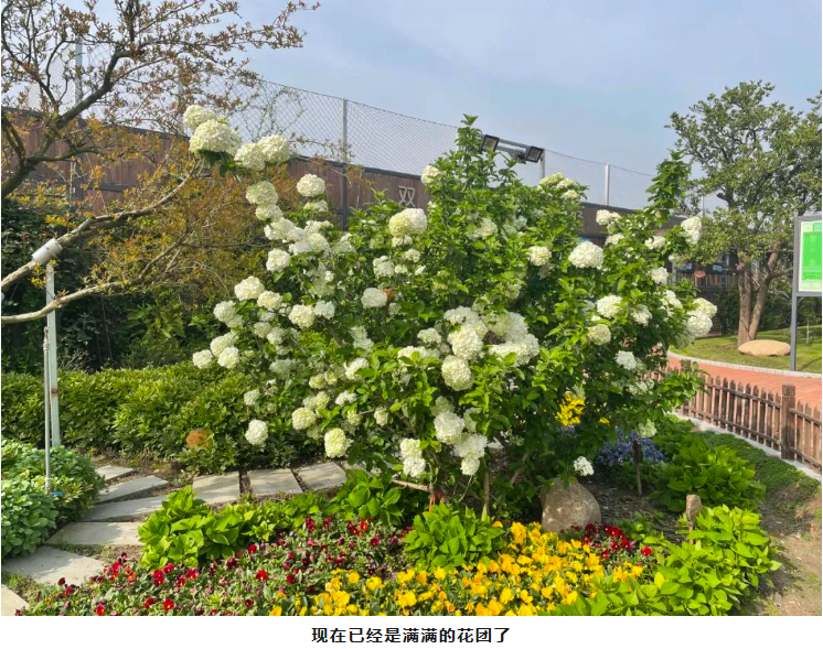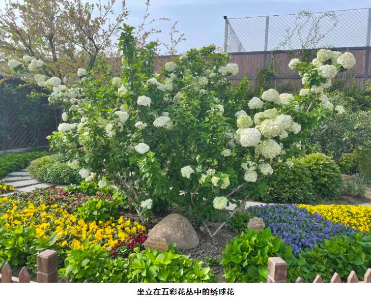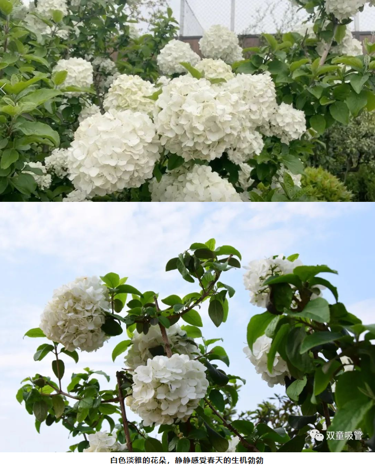 一進入“雙童”空中花園,就能看到群花斗艷。在萬紫千紅里,一顆白色的花樹尤其顯眼。繡球花盛開在春季,其余時間都是綠色枝丫。每年的四月是最佳觀賞期,也就是說,現(xiàn)在想一覽好風(fēng)光的可要抓緊時間啦!