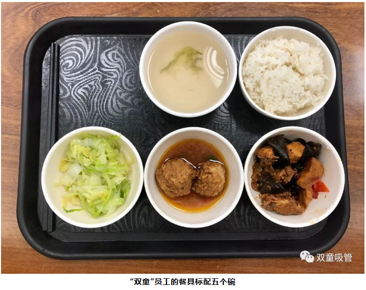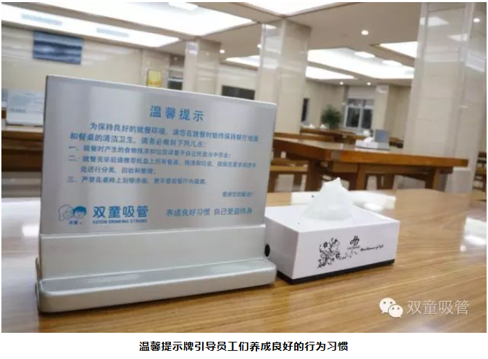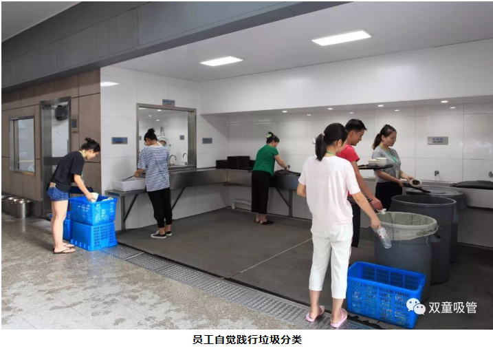 在“雙童”600余人就餐的員工餐廳里,濕垃圾也是“雙童”垃圾分類經(jīng)的一大重點!“五個碗”是雙童員工的餐具標配,在每張餐桌上都擺放著用餐規(guī)范的標語提示牌。