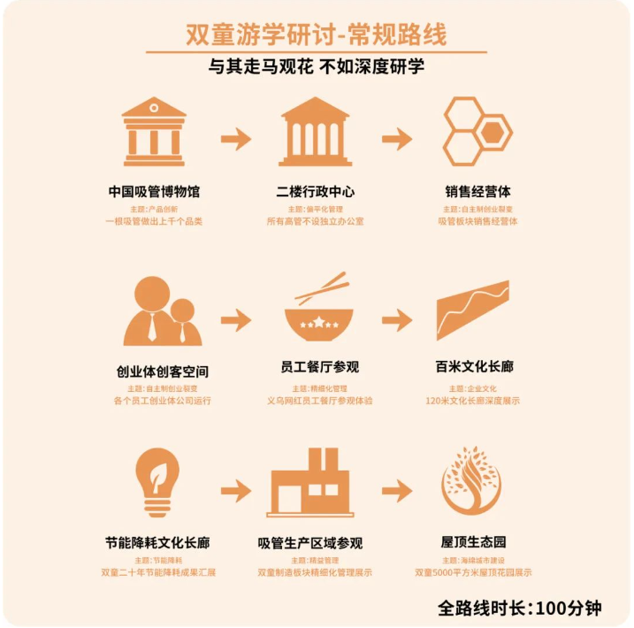 此外,我們還會(huì)帶領(lǐng)大家現(xiàn)場(chǎng)參觀 全球首家吸管博物館, “雙童”清潔無(wú)塵車間, 每年省下300多萬(wàn)的節(jié)能降耗系統(tǒng), 集雙童故事、文化、經(jīng)營(yíng)理念等于一身的文化長(zhǎng)廊, 還有5000㎡的空中生態(tài)園! 更可現(xiàn)場(chǎng)觀摩“雙童”獨(dú)特的內(nèi)部創(chuàng)業(yè)模式, 與各創(chuàng)業(yè)體負(fù)責(zé)人互動(dòng)交流, 探尋“雙童”獨(dú)特的文化魅力!