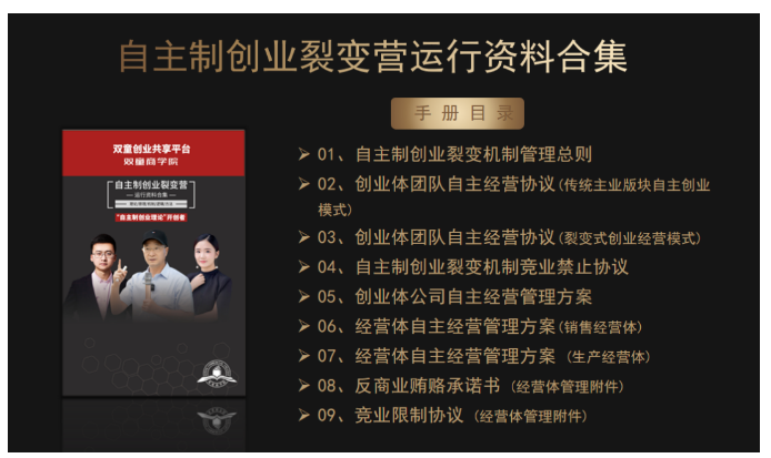3、交付自主制創(chuàng)業(yè)裂變模式的各項(xiàng)規(guī)則、文本、合同等書(shū)面資料