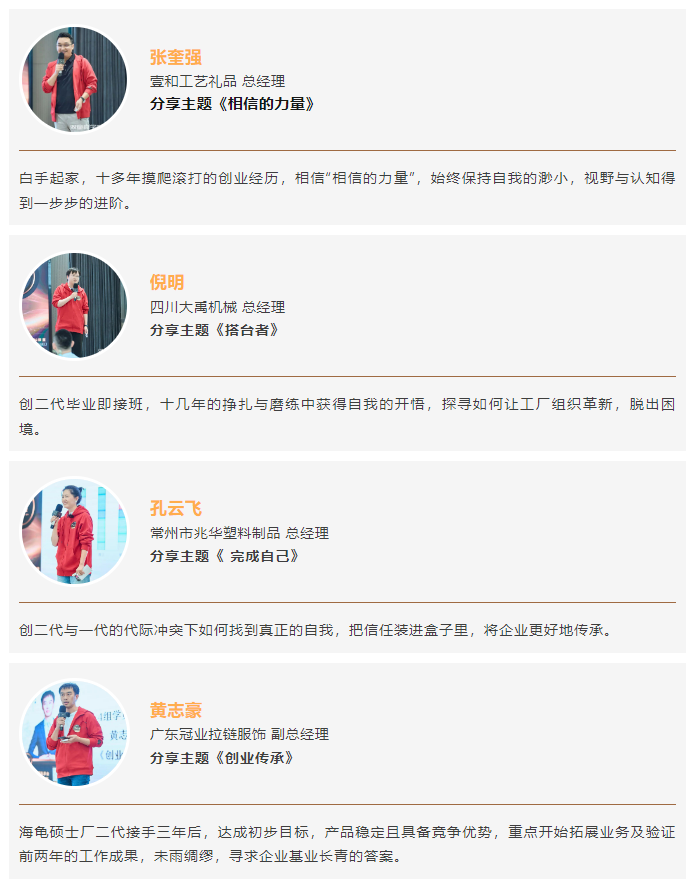 因此,在開學典禮上,四位具有代表性的學員分享介紹了自己在企業(yè)經營的心路歷程,并表達了升級思維的期待,解決目前的企業(yè)傳承與轉型發(fā)展問題。