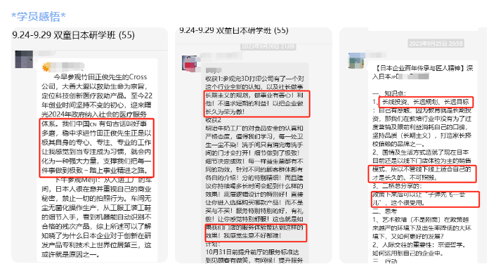 兩期日本企業(yè)游學(xué)之旅,很多學(xué)員都深受啟發(fā),在貫穿研學(xué)全程的巴士課堂上大家暢所欲言,分享所見所得所想。無論是從巴士課堂上的分享發(fā)言、還是從形成文字感悟來看,都能看出來大家收獲滿滿!