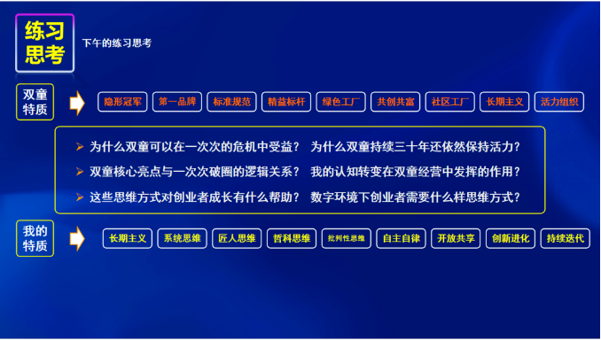 一千個(gè)人眼中有一千個(gè)哈姆雷特,36位同學(xué)來(lái)自各行各業(yè),帶著自己的經(jīng)驗(yàn)認(rèn)知,以及“開門”思維,一齊就多個(gè)“雙童”案例的開放式問(wèn)題進(jìn)行總結(jié)歸納,并探討各自企業(yè)復(fù)制經(jīng)驗(yàn)的可能性。