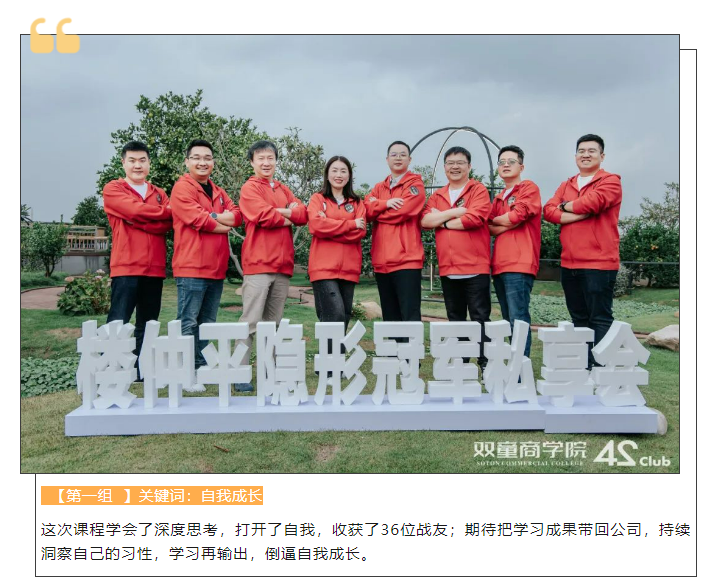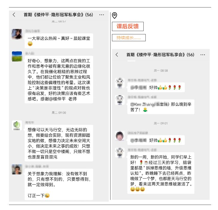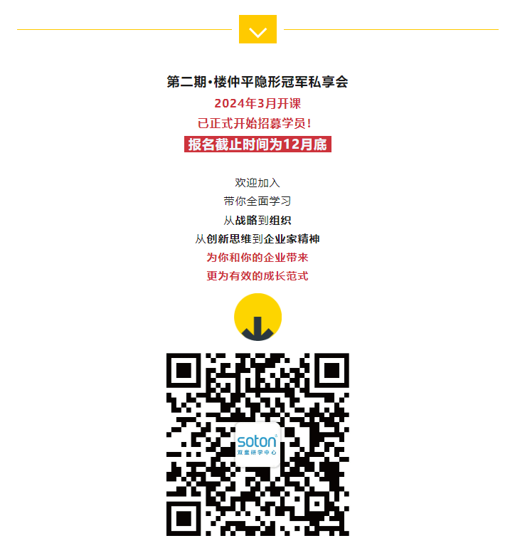 目前,樓仲平隱形冠軍私享會(huì)第一期已結(jié)束第一模塊的學(xué)習(xí),接下來(lái)繼續(xù)開展6大模塊,主題分別為“破圈”、“取舍”、“進(jìn)化”、“案例”、“出發(fā)”、“開悟”,一起期待吧!