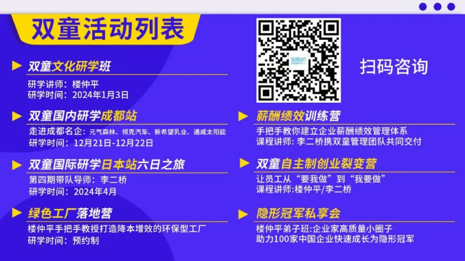 樓仲平今年59歲,幾乎全年無休。他笑稱,自己目前對(duì)雙童的直接管理幾乎為零,更多的是通過思考的決策參與進(jìn)去,但“比以前更忙了”,忙著準(zhǔn)備課件、講課、帶學(xué)員外出考察,忙著讓雙童孵化出更多新的創(chuàng)業(yè)體。這位幾乎沒有受過基礎(chǔ)教育的創(chuàng)業(yè)者,研讀經(jīng)濟(jì)學(xué)書籍,形成自己的思維體系并傳遞,“他們現(xiàn)在叫我‘畫餅大師’,說我一天到晚在小視頻里畫餅,如果我能幫他們把餅畫出來,何其榮幸?!?/p>