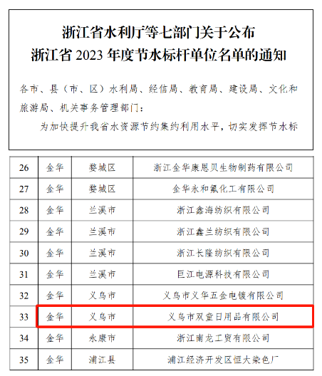近日,浙江省水利廳等七個部門聯(lián)合公布了浙江省2023年度節(jié)水標(biāo)桿單位名單,義烏市雙童日用品有限公司再次上榜!