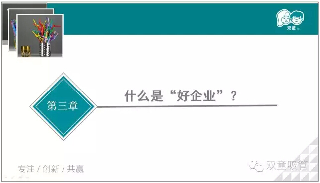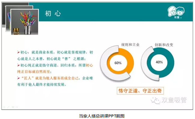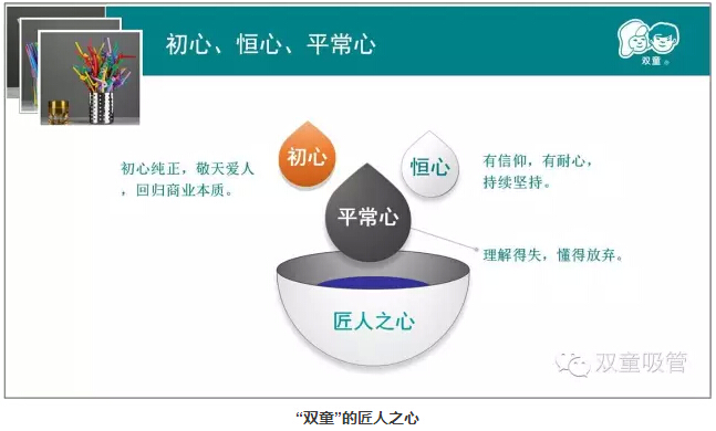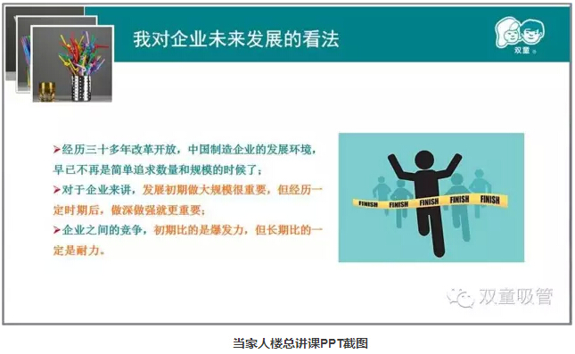 恒心則需要有以10年為單位的戰(zhàn)略耐心。以博大的胸懷把一件事情做好。當(dāng)家人說(shuō),”雙童“的創(chuàng)新工作都是以十年為一個(gè)單位來(lái)進(jìn)行。而當(dāng)家人自己則是”老板不解眼前憂“,培養(yǎng)專業(yè)的經(jīng)理人團(tuán)隊(duì)去解決企業(yè)問(wèn)題,自己把目光放長(zhǎng)遠(yuǎn),每五年做一次“五年規(guī)劃”。