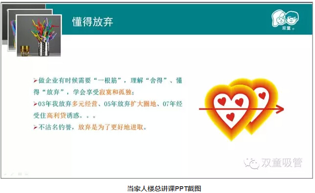 最后,當(dāng)家人樓總向大家說(shuō)明了何為“平常心”。2003年,他放棄了多元經(jīng)營(yíng);2005年,他放棄了擴(kuò)大圈地;2007年,他經(jīng)受住了高利貸誘惑……他誠(chéng)懇地和大家說(shuō),一個(gè)人一輩子,“一生做好一件事”就已經(jīng)很了不起了。做企業(yè)有時(shí)候需要“一根筋”,理解“舍得”、懂得“放棄”,學(xué)會(huì)享受寂寞和孤獨(dú)!