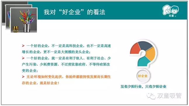 何為好企業(yè)?當(dāng)家人樓總和大家分享:“別人好,你好;別人不好,你還好!”做一個(gè)好企業(yè)一定要有利于他,有利于社會(huì)。少浪費(fèi)資源,少產(chǎn)生污染,不過(guò)分依靠政府,不等待政府變化。一定要?jiǎng)?chuàng)造價(jià)值,無(wú)論環(huán)境如何變化起伏,始終都能持續(xù)發(fā)展,長(zhǎng)期生存!