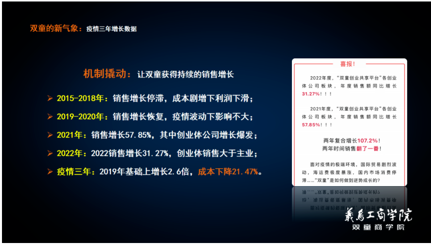 2018年開(kāi)始,第二創(chuàng)業(yè)體的“雙童進(jìn)出口”和第三創(chuàng)業(yè)體的“義童國(guó)際貿(mào)易”相繼成立,成為我們國(guó)際貿(mào)易板塊的主力軍。2020年6月,第五創(chuàng)業(yè)體的“雙童商學(xué)院”成立,開(kāi)啟了公司創(chuàng)業(yè)教育的新板塊;第六創(chuàng)業(yè)體、第七創(chuàng)業(yè)體、第八創(chuàng)業(yè)體、第九創(chuàng)業(yè)體……,不到五年時(shí)間,持續(xù)裂變出15家員工創(chuàng)業(yè)體公司,和21位員工自主經(jīng)營(yíng)體板塊,35位員工在公司獲得了創(chuàng)業(yè)的機(jī)會(huì),成為了真正創(chuàng)業(yè)公司的創(chuàng)始股東,推動(dòng)員工實(shí)現(xiàn)從打工到老板的華麗轉(zhuǎn)身,實(shí)現(xiàn)企業(yè)和員工的共同成長(zhǎng)和共同富裕。在過(guò)去的疫情三年時(shí)間里,我們依然保持2.6倍的快速增長(zhǎng),公司在義烏企業(yè)的綜合排名也從2019年的92位,一路上揚(yáng)進(jìn)入到去年的第32位。員工創(chuàng)業(yè)板塊的創(chuàng)新業(yè)務(wù),在短短五年時(shí)間里再造了兩個(gè)雙童。