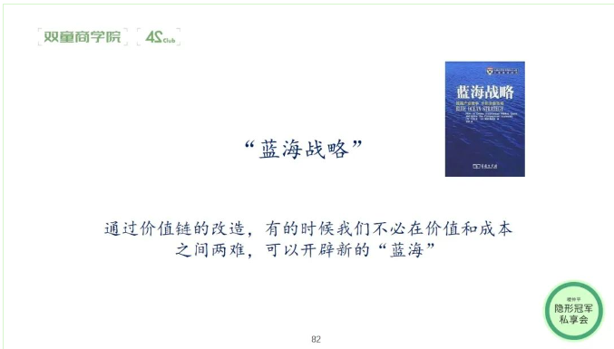企業(yè)要如何開辟新的“藍(lán)海”?鄧博士在課上給出了一種開辟新市場的戰(zhàn)略行動—“藍(lán)海戰(zhàn)略”。企業(yè)可以通過“加減乘除”的方法在優(yōu)化價(jià)值表現(xiàn)的同時(shí)優(yōu)化成本結(jié)構(gòu),走出“價(jià)值-成本兩難” ,在客戶特別“講究”的一兩個(gè)利益點(diǎn)上做得特別突出;在客戶必須的那些利益點(diǎn)上保持一定水準(zhǔn);在客戶可以“將就”的利益點(diǎn)上降低投入,這樣就可以為企業(yè)開辟一個(gè)新的藍(lán)海,可以在一定時(shí)期內(nèi)享有近乎壟斷的市場地位,但這種壟斷是暫時(shí)的。