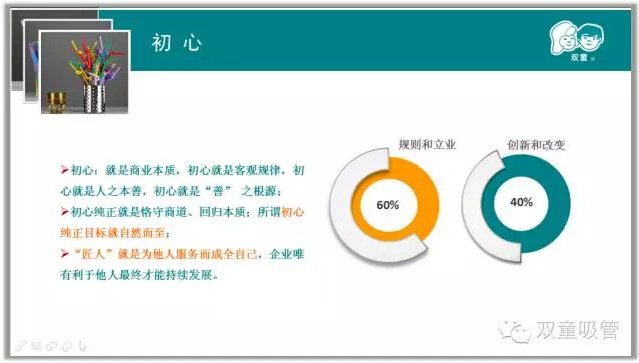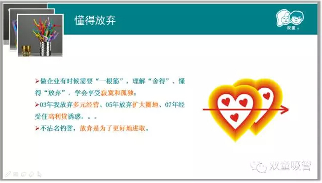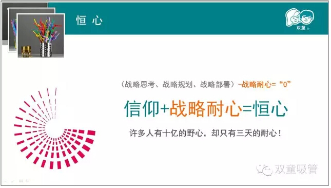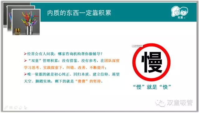 我們強(qiáng)調(diào)戰(zhàn)略思考、戰(zhàn)略規(guī)劃、戰(zhàn)略部署,唯獨(dú)缺少戰(zhàn)略耐心。雙童堅(jiān)持小客戶原則,堅(jiān)持對(duì)員工投入,堅(jiān)持走差異化的道路,雙童的發(fā)展也越來越好。創(chuàng)新就是改變,就是持續(xù)積累。創(chuàng)新需要戰(zhàn)略耐心,需要十年為一個(gè)單位的恒心。