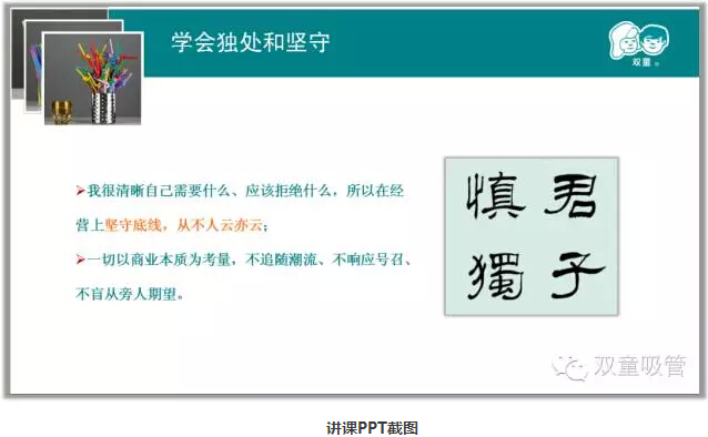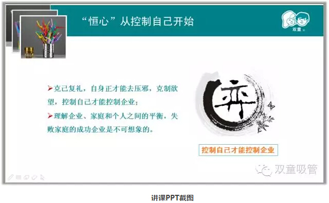 課程正式開始!當(dāng)家人樓總用了兩個(gè)多小時(shí)的時(shí)間,向大家闡述了他經(jīng)營”雙童“二十多年所積累下來的寶貴經(jīng)驗(yàn)心得。其中,當(dāng)家人樓總重點(diǎn)向大家講述了”雙童“由初心、恒心、平常心組成的”匠人之心“。