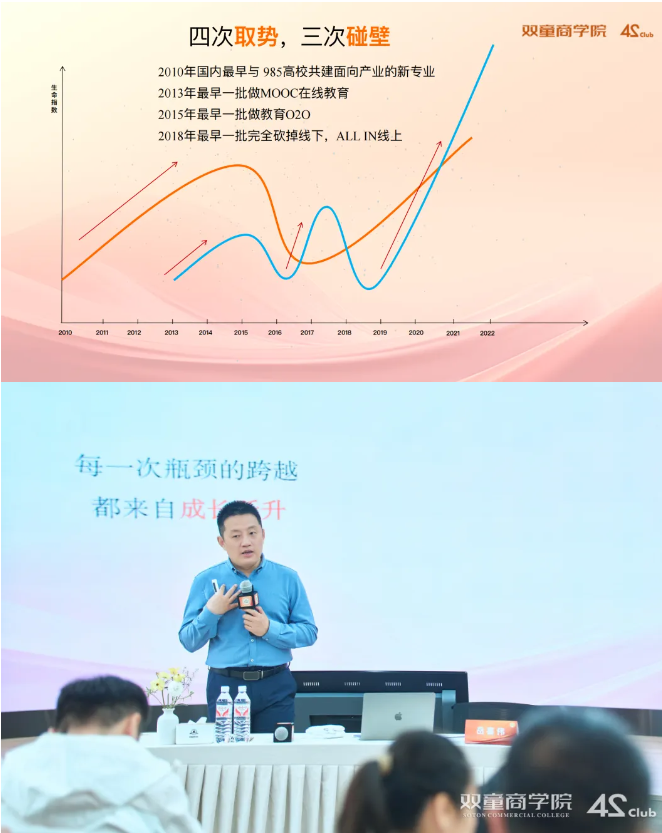 岳喜偉老師在課堂上分享了慧科集團通過“四次取勢,三次碰壁”,花費6年的時間探索,才形成了企業(yè)的“第二曲線”,而這期間企業(yè)遇到的每一次“瓶頸期”和實現(xiàn)的突破都源自于創(chuàng)業(yè)者的認知局限和成長躍升!