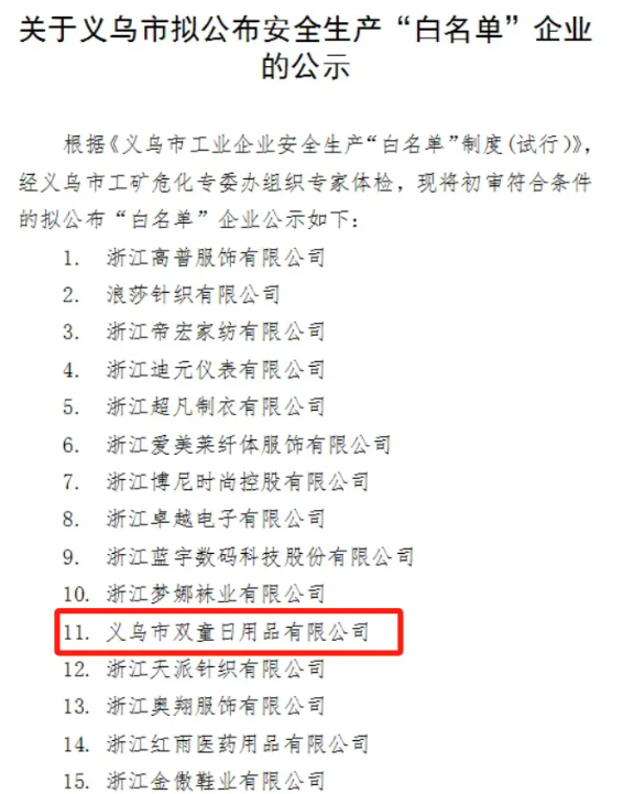 安全重于泰山,安全生產(chǎn)“白名單”企業(yè)這份榮譽,既是肯定,也是鞭策,在今后的工作中,“雙童”也會繼續(xù)做好安全學習,努力增強員工的自我管理、自防、自救能力,樹立安全意識,共創(chuàng)一個安全、有序、高效的生產(chǎn)環(huán)境!