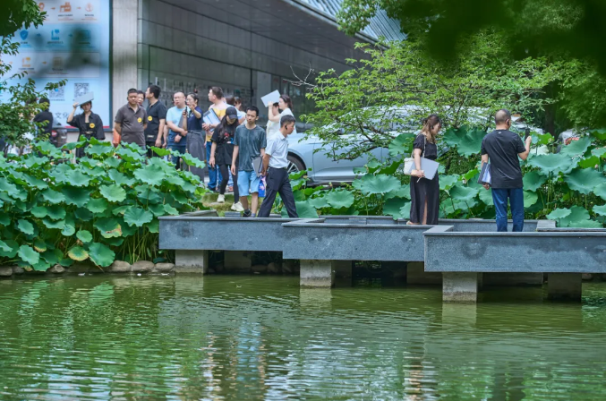 傍晚,員工們?nèi)齼沙扇郝綐蚺?,沉醉荷池美景。聽瀑布潺潺,看斜陽映水,魚兒游弋添生機(jī)。時光寧靜美好,幸福感滿溢,令人向往,愜意無比!