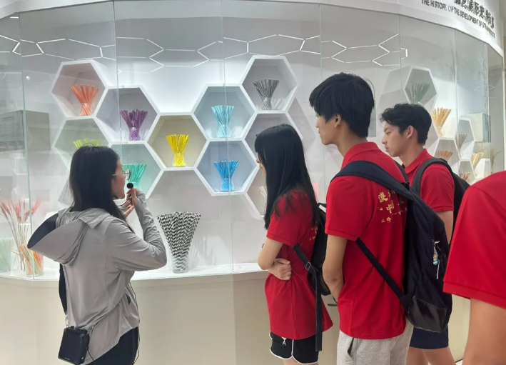 隨后,同學們深入吸管博物館展區(qū),逐一探索了吸管的歷史演變:從原始的秸稈吸管,到工業(yè)初期的紙制吸管,再到現(xiàn)代普及的塑料吸管,直至未來趨勢的聚乳酸可降解吸管,每一步都見證了人類智慧與環(huán)保意識的進步。