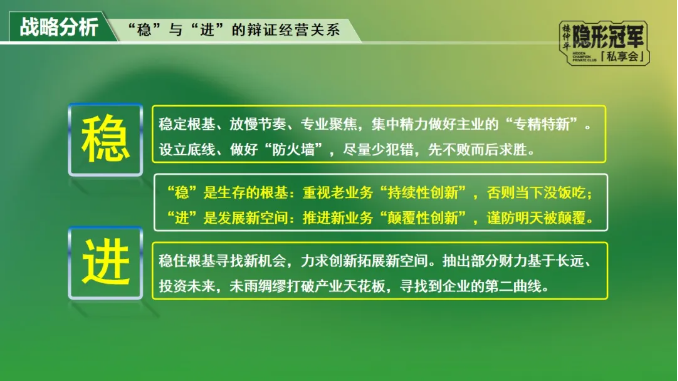 中國社會經濟歷經幾十年發(fā)展,經歷了粗放經營的“原始積累”階段,做強做大的“快速發(fā)展”階段。現(xiàn)階段已進入到“專精特新”轉型和創(chuàng)新階段,真正能挨過一個個經濟寒冬并實現(xiàn)基業(yè)長青的企業(yè),一定是極致專注,并在某一細分領域處于絕對領先地位的隱形冠軍和產業(yè)小巨人。