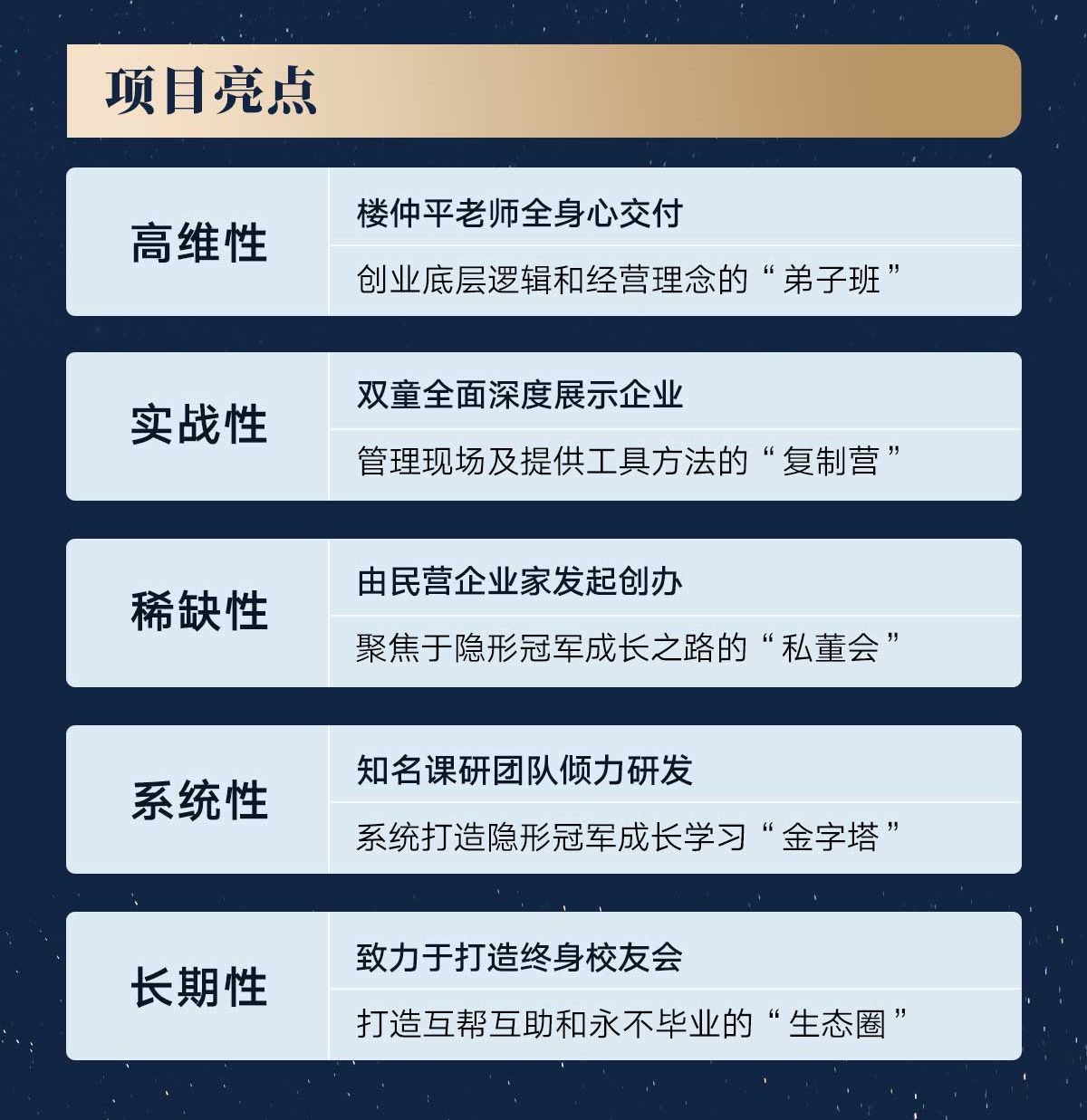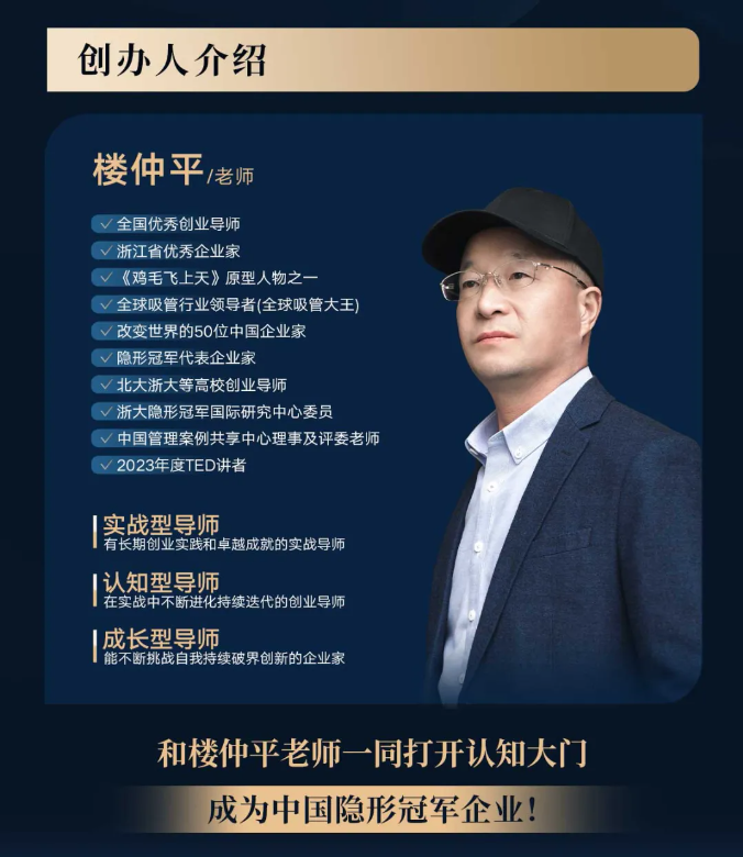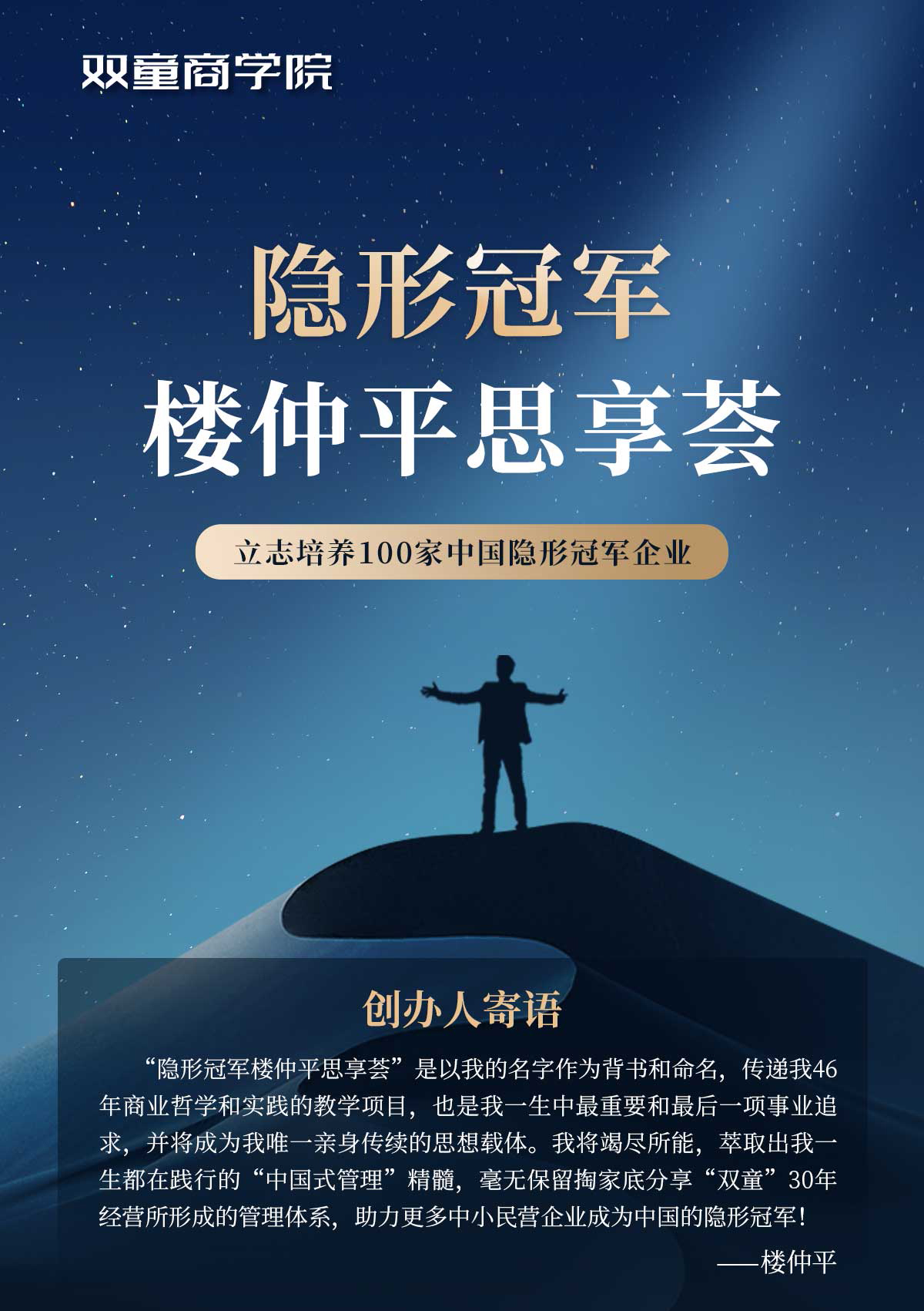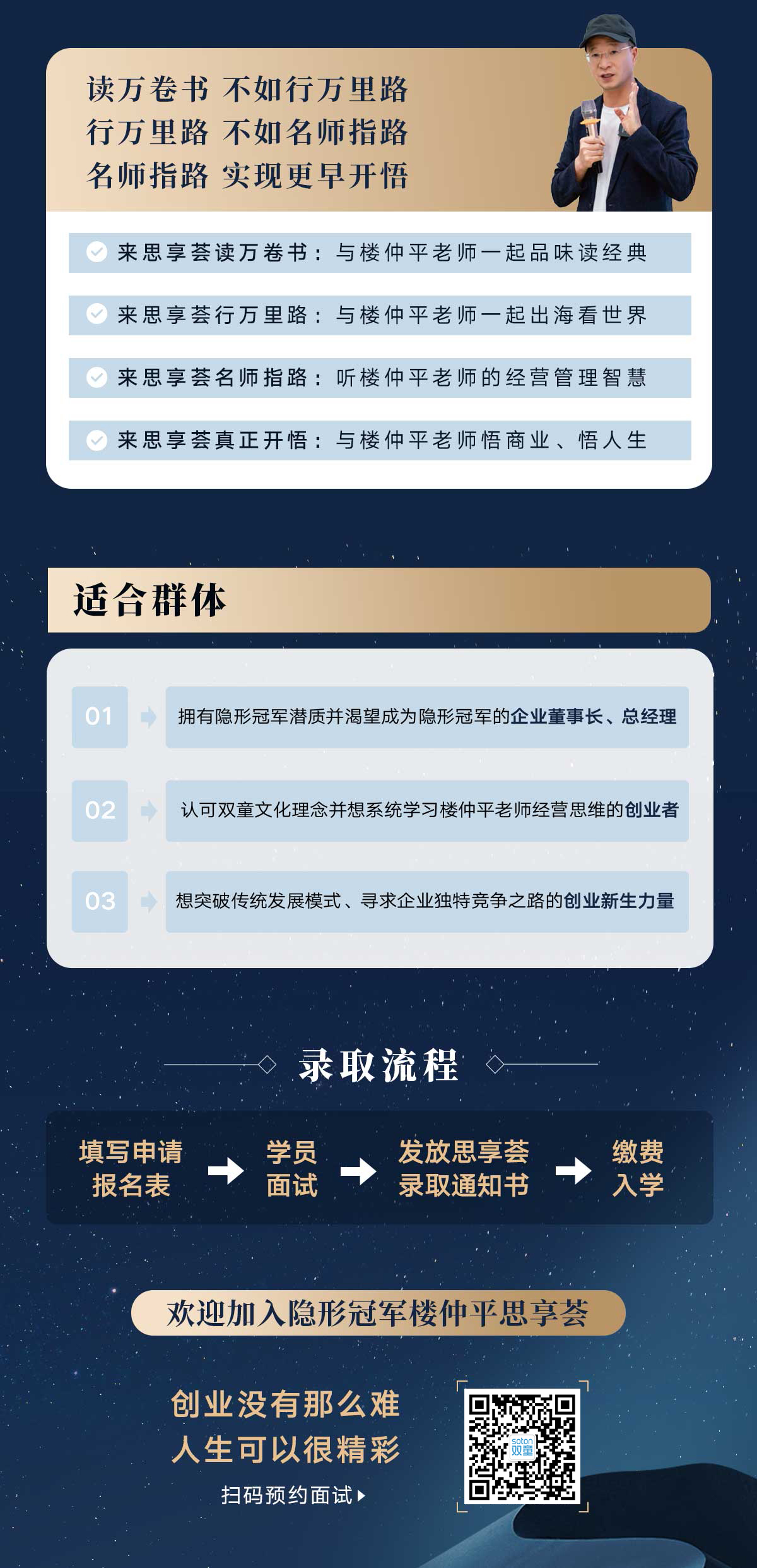 如果你是創(chuàng)業(yè)者、學習者、思想者,希望在經營領域有自己的思考和洞察,那么《隱形冠軍樓仲平思享薈》就是為你量身定制,今年最后一期招生,一班只招40位同學,名額所剩不多,抓緊機會哦!
