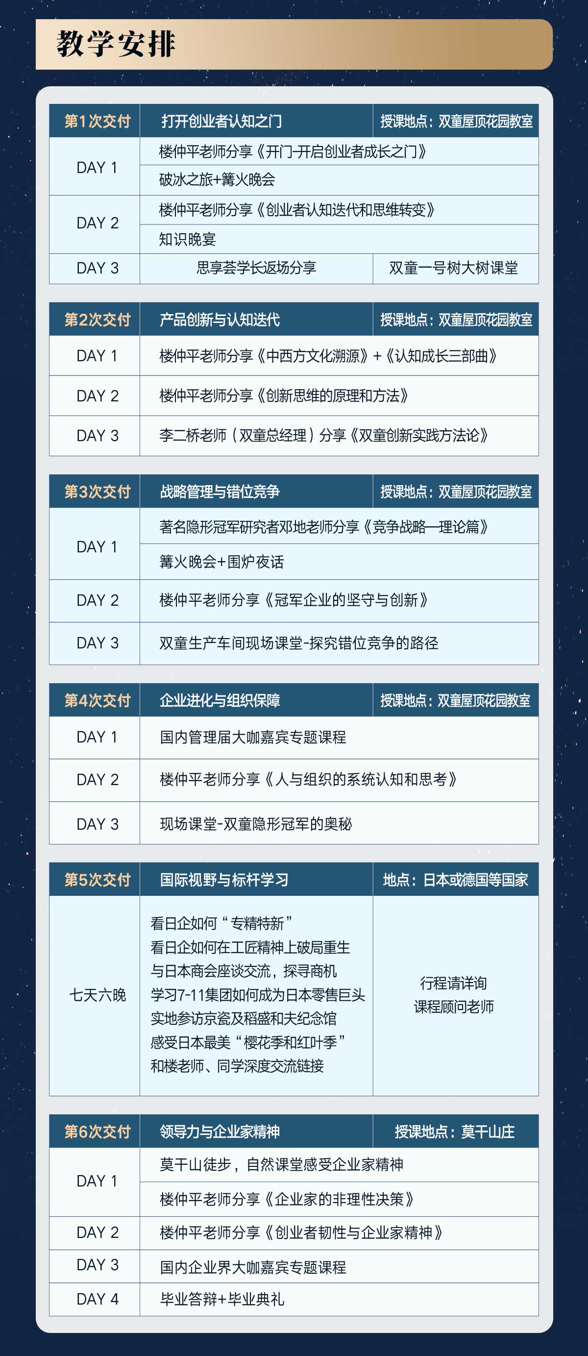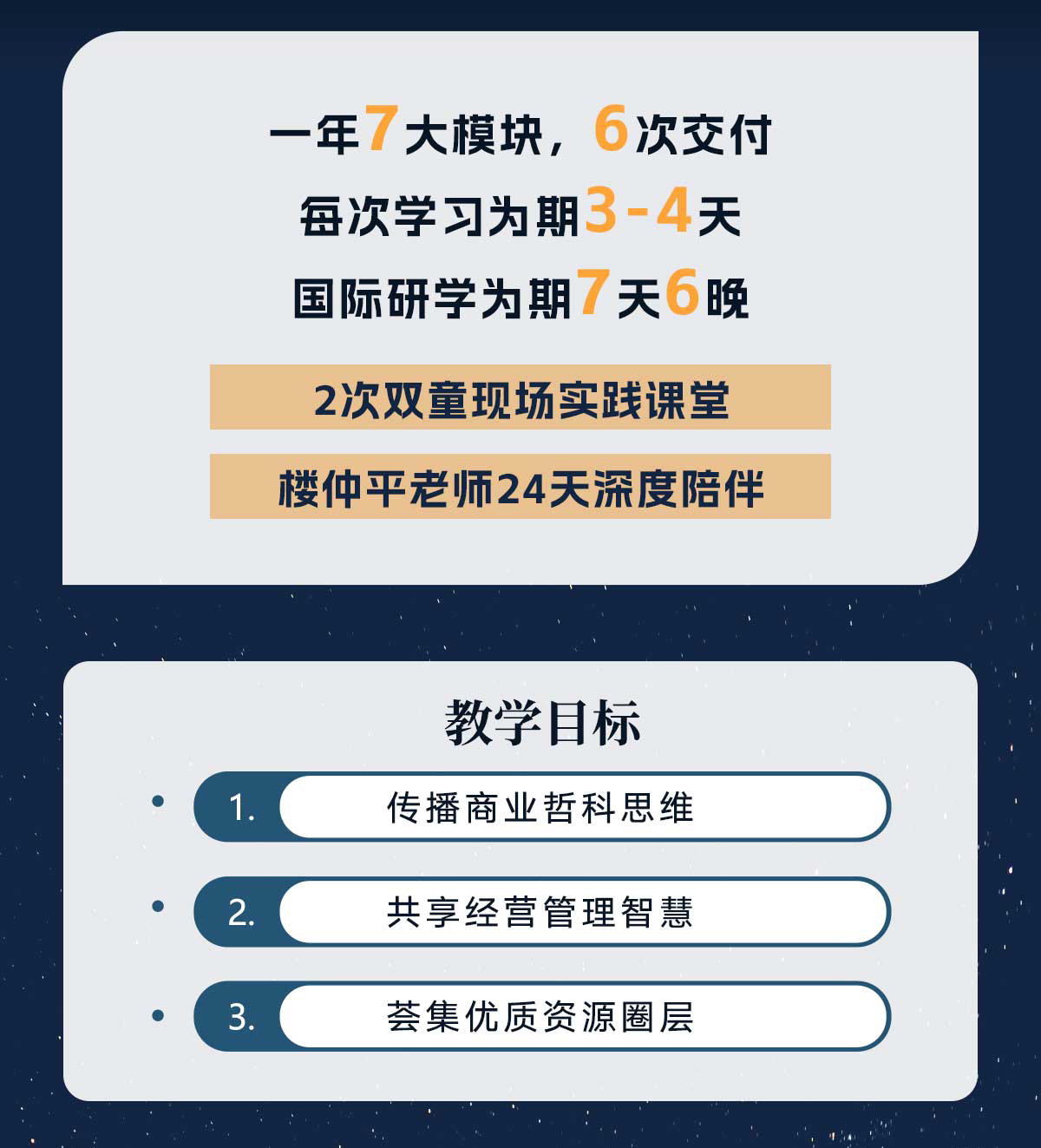 也是樓總唯一一個全面系統(tǒng)交付46年創(chuàng)業(yè)歷程的經驗總結和思維模型的課程。全年6期課程,樓老師24天深度陪伴,從戰(zhàn)略到組織,從創(chuàng)新思維到企業(yè)家精神,幫助你的企業(yè)全方位升級。