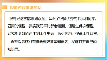 課程雖然會(huì)“殺青”,但是同窗的情義永不解散,也相信完成了最后《成長(zhǎng)有速度》模塊的學(xué)習(xí)后,能夠在企業(yè)內(nèi)部落地更有深度,同學(xué)們都能成為一個(gè)卓越的管理者,帶領(lǐng)企業(yè)的伙伴、也帶著自己,攀登一個(gè)新的高度!