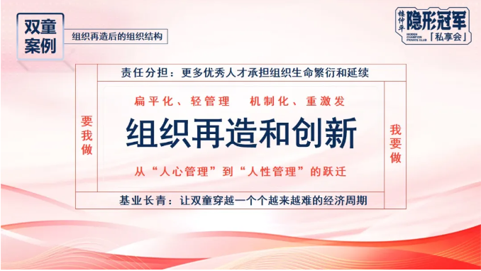 而當(dāng)下,“雙童”所推行的自主制創(chuàng)業(yè)裂變機(jī)制則是通過(guò)撬動(dòng)人性,讓更多優(yōu)秀人才承擔(dān)組織生命繁衍和延續(xù),從而讓企業(yè)實(shí)現(xiàn)基業(yè)長(zhǎng)青!