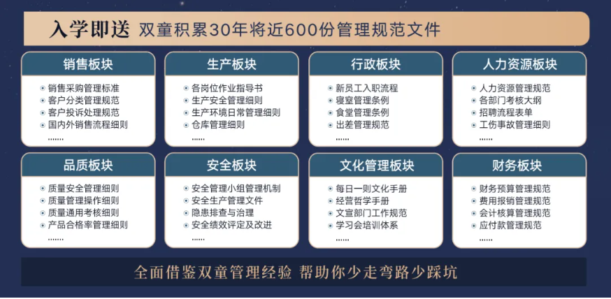 所以,入學(xué)“隱形冠軍樓仲平思享薈”之后,項(xiàng)目組會(huì)將“雙童”積累了30年、包含了銷售、生產(chǎn)、行政、人類資源、品質(zhì)、安全和文化管理7大板塊,將近400分管理規(guī)范文件,全部打包給學(xué)員,幫助學(xué)員企業(yè)能夠全面借鑒雙童管理經(jīng)驗(yàn)、少走彎路、少踩坑!