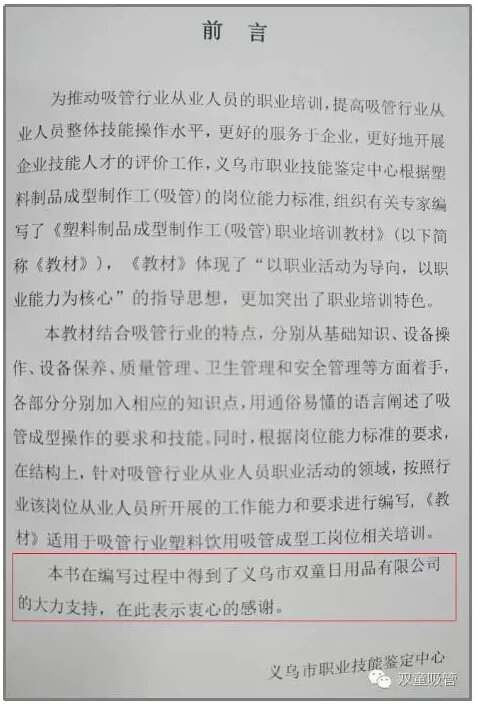 近期,由“雙童”代表行業(yè)編制的義烏市職業(yè)技能培訓(xùn)教材《吸管成型工培訓(xùn)教材》正式面世!這本書(shū)將作為吸管行業(yè)塑料飲用吸管成型工崗位的培訓(xùn)教材,以后吸管成型工將可以有國(guó)家資質(zhì)認(rèn)定了,對(duì)整個(gè)吸管行業(yè)來(lái)說(shuō)都是一次技能與操作上的統(tǒng)一提升。