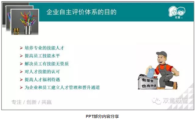 通過(guò)企業(yè)自主評(píng)價(jià)體系,員工們可以對(duì)照該體系,努力提升自己的技能,解決工作上的難題。而作為公司來(lái)說(shuō),以后在評(píng)價(jià)員工的工作技能水平上,將有一個(gè)標(biāo)準(zhǔn)的評(píng)判依據(jù),大大有助于對(duì)員工的技能培訓(xùn),使其“茁壯成長(zhǎng)”全面提升,留住真正的人才!
