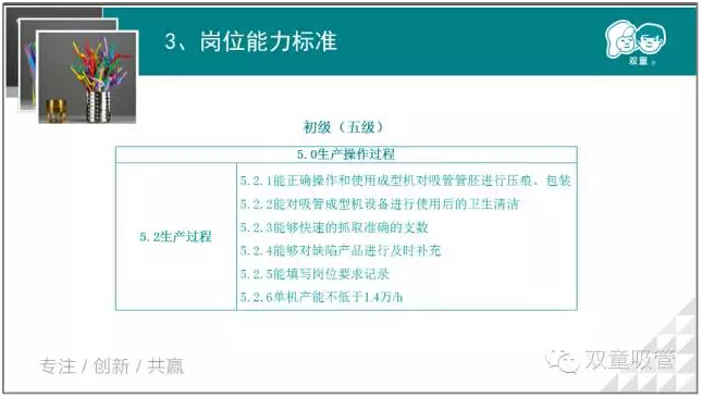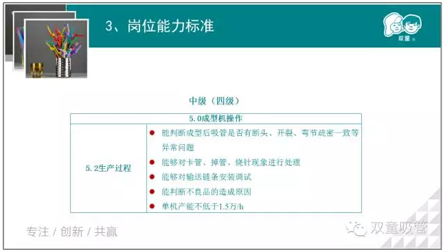 接下來(lái),我們將根據(jù)吸管成型工的標(biāo)準(zhǔn)體系,對(duì)吸管成型工崗位的初級(jí)、中級(jí)、高級(jí)等五個(gè)等級(jí)進(jìn)行劃分,鼓勵(lì)員工們進(jìn)行報(bào)考職業(yè)等級(jí)證書(shū),提升自我!