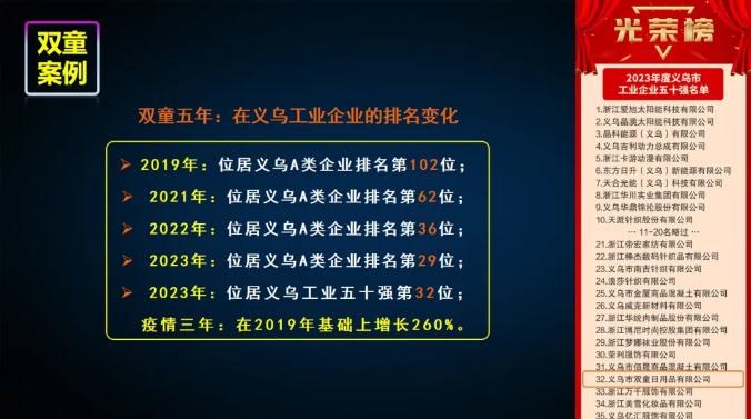 2023年,平臺整體增長35.24%;平臺稅收增長23.30%,成功登榜“納稅千萬元以上工業(yè)企業(yè)”和“義烏市工業(yè)企業(yè)五十強”!