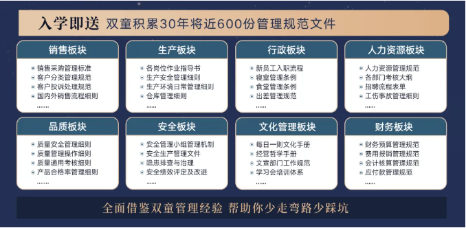 所以,入學(xué)“隱形冠軍樓仲平思享薈”之后,項目組會將“雙童”積累了30年、包含了銷售、生產(chǎn)、行政、人類資源、品質(zhì)、安全和文化管理7大板塊,將近600分管理規(guī)范文件,全部打包給學(xué)員,幫助學(xué)員企業(yè)能夠全面借鑒雙童管理經(jīng)驗、少走彎路、少踩坑!