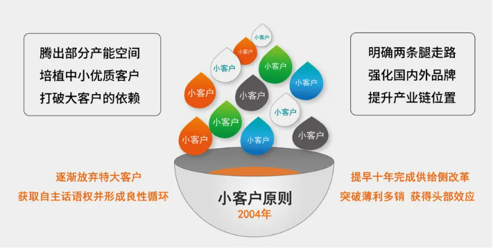 因此,“雙童”推出了小訂單策略,做出規(guī)定:要求業(yè)務員逐步放棄沒有利潤的大客戶,騰出產(chǎn)能空降培植日本和歐盟的中小客戶;拓展國內(nèi)高端市場和個性化定制,形成“兩條腿走路”布局;每個客戶的訂貨數(shù)量絕不允許超過本廠生產(chǎn)總量的5%。
