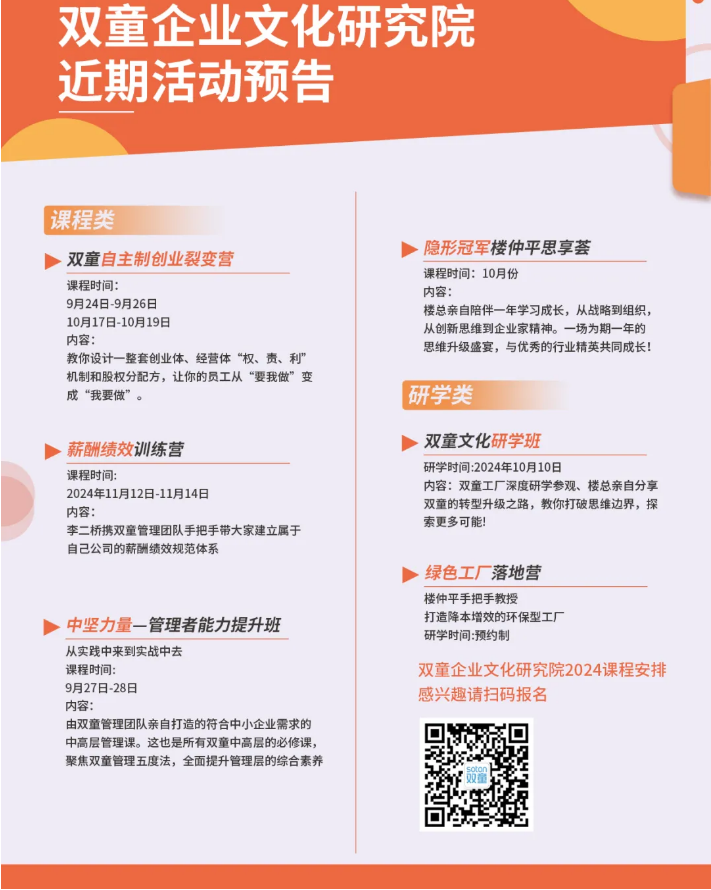 如果你也對“雙童”充滿好奇,也想賦能團隊共同成長,歡迎走進10月10日【雙童文化研學班】,與上百位優(yōu)秀的創(chuàng)業(yè)者一起學習!少量名額,歡迎咨詢鎖定!